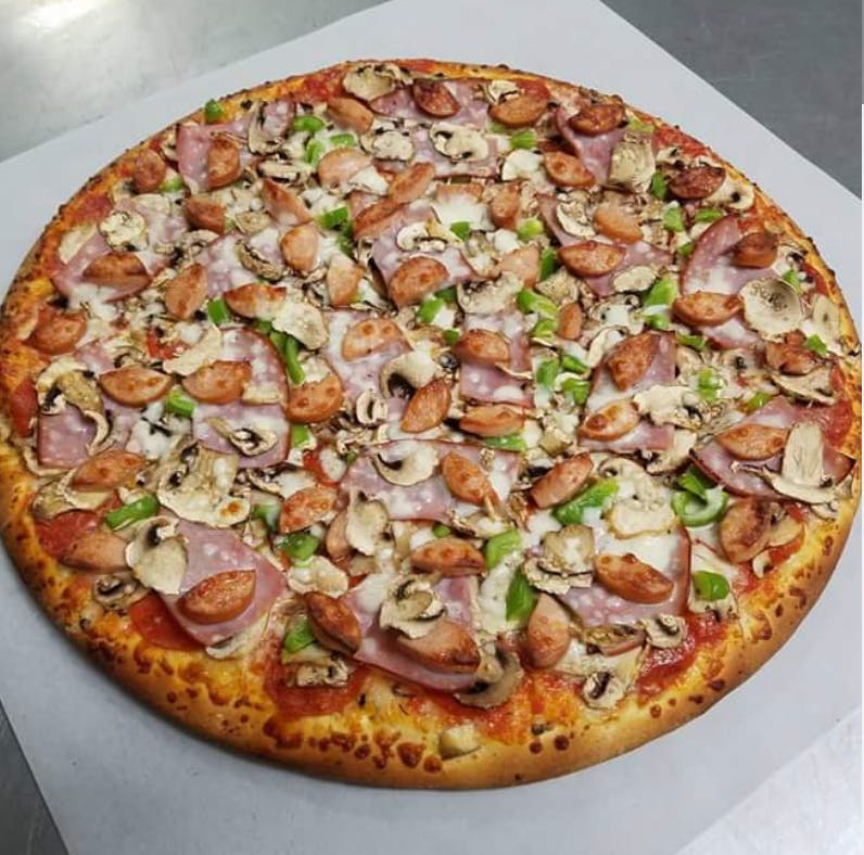 Tomato sauce, mozzarella cheese, pepperoni, salami, canadian bacon, italian sausage, meatball.