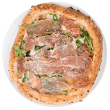 Italian tomato sauce and fresh mozzarella. Topped with prosciutto and baby arugula after bake.