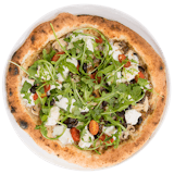 Truffle cream, mozzarella, and mushrooms. Topped with prosciutto and baby arugula after bake (no tomato sauce).