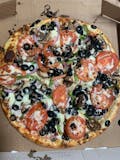 Pizza sauce, mozzarella cheese, mushroom, onion, bell peppers, black olives & tomatoes.