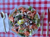 Fresh lettuce, tomatoes, green peppers, red onions, cucumbers, and black olives.