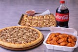 One 20" Pizza with one topping, 20 wings, cheesy sticks and 2 liter soda.