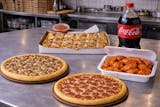 Two medium 12” pizza with 2 toppings, 10 wings, 1 lasagna with garlic bread, 1 regular Garden or Caesar salad, 2-liter soda, and 2 cannoli or cake.
