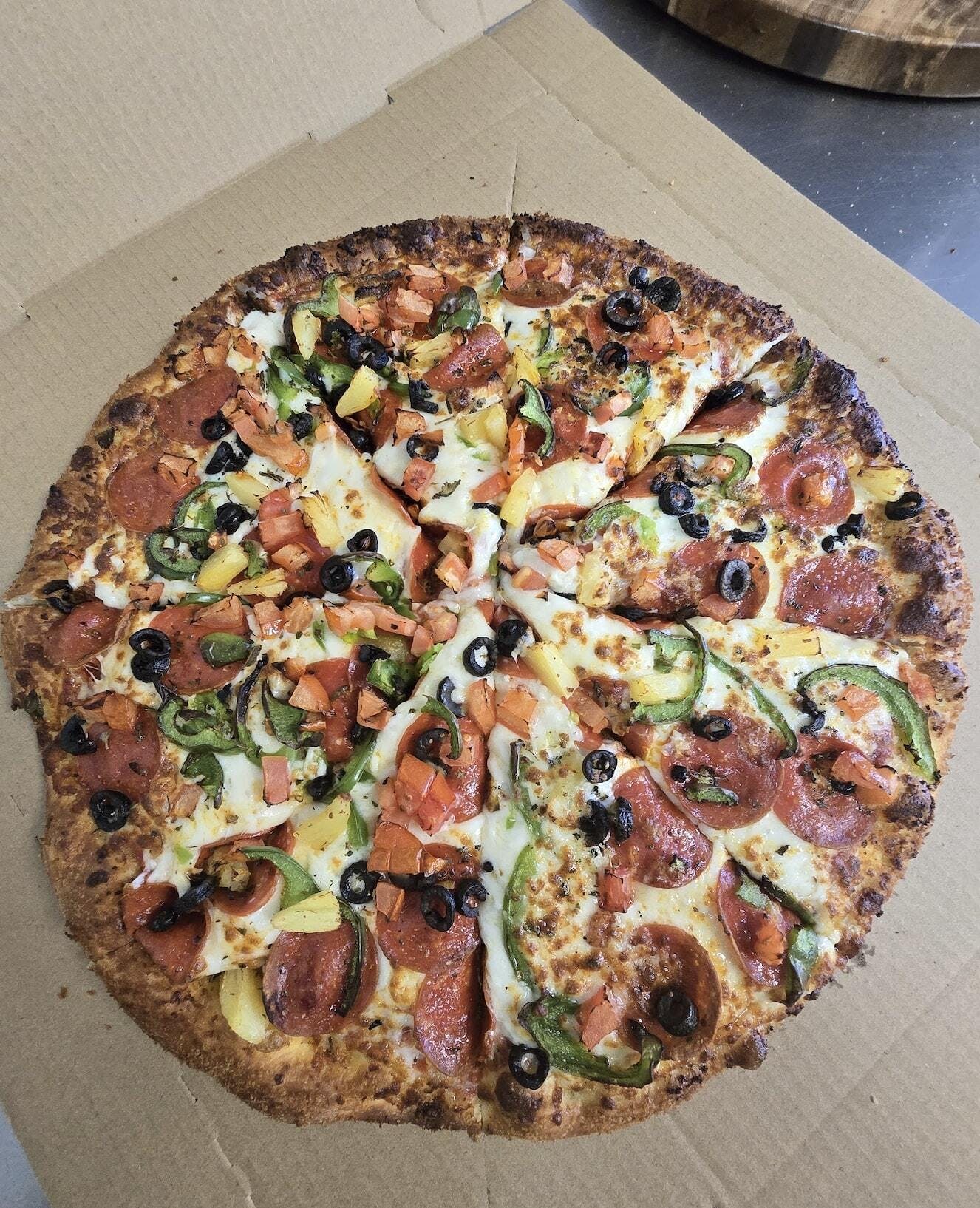 Pepperoni, onion, green peppers, olives, sausage & pineapple.