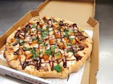 BBQ sauce, mozzarella cheese, diced chicken breast, red onions, topped with fresh cilantro and bbq sauce drizzle.