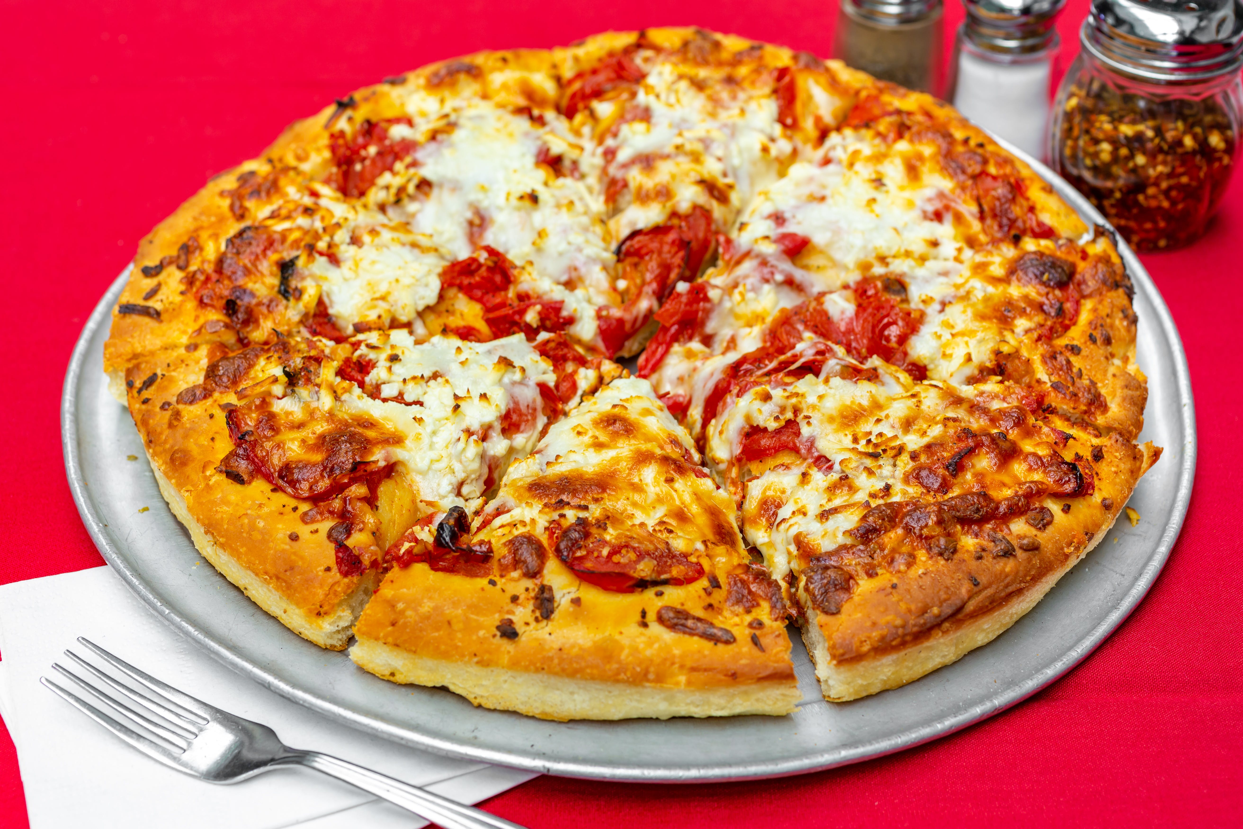 Feta, mozzarella, parmigiana cheese, and fresh tomatoes.