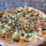 Tomato sauce, spinach, broccoli, mushroom, red onion, green bell pepper, tomato, mozzarella & romano cheese.