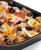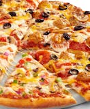 Pepperoni, Italian sausage, ground beef, mushrooms, mixed onions, green peppers, black olives, cheddar, whole-milk mozzarella, and traditional red sauce.