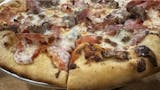 Stanislaus tomato sauce, pepperoni, salami, smoked ham, sausage, apple-wood smoked bacon, mozzarella cheese, parmesan cheese.