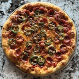 Stanislaus tomato sauce, pepperoni, mozzarella, cheddar, fresh jalapenos, calabrian chili flakes, hot honey.