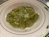 Pasta in a traditional pesto sauce with pine nuts, sweet basil, garlic, a touch of cream and parmigiano.