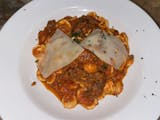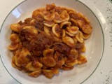 Braised beef filled with pecorino cheese and garlic in a tomato sauce over orecchiette pasta.