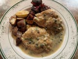 Chicken breast sautéed with white wine, capers and lemon juice. Served with roasted potatoes and vegetables.