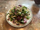 Arugula, radicchio, Belgian endive, fennel, roasted shallots and tomatoes tossed with lemon vanilla vinaigrette topped with gorgonzola cheese.