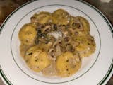 Homemade cheese filled pasta with a mix of wild mushrooms in a truffle butter, sage sauce.