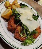 Veal scaloppini breaded and sautéed, topped with arugula and shaved parmigiano cheese. Served with roasted potatoes and sautéed spinach.