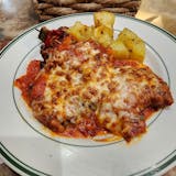 Breaded chicken breast baked with mozzarella cheese and tomato sauce. Served with roasted potatoes and vegetables.
