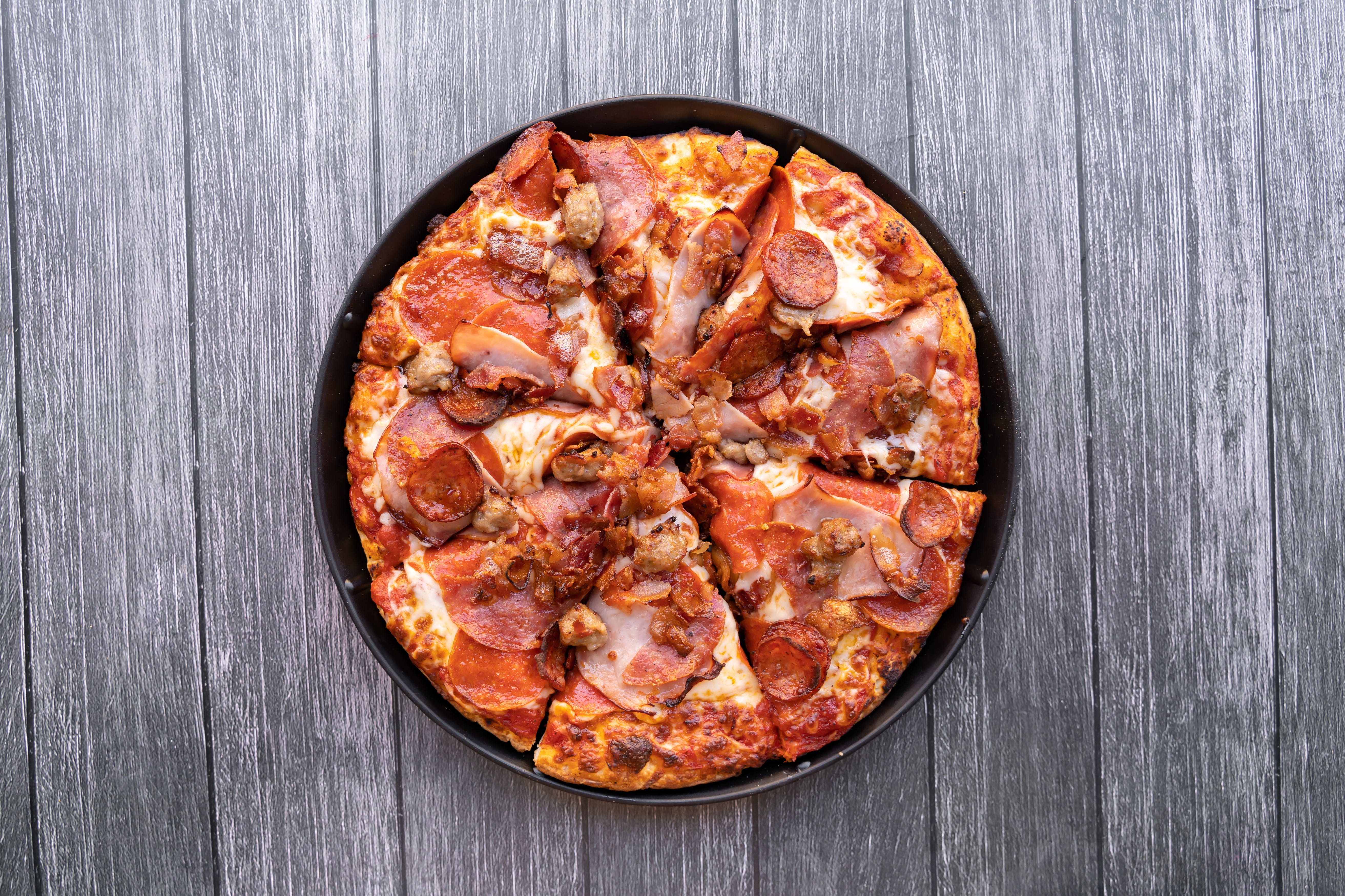Ham, Pepperoni, Sausage, Salami, Bacon with pizza sauce and melted cheese.