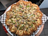 White alfredo garlic sauce, cheese, Canadian bacon chicken, shredded bacon, tomatoes with green onions.