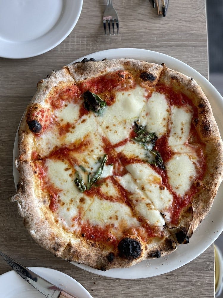 Tomato sauce, mozzarella, basil, Parmigiano. Vegetarian.