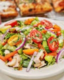 Romaine, cubed chicken breast, red bell peppers, red onions, parsley, and red wine vinaigrette.