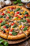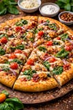 Fresh spinach layered with Greek peppers, red onions, black olives, Roma tomatoes, and tangy feta cheese, finished with oregano and your choice of classic red sauce or basil pesto.