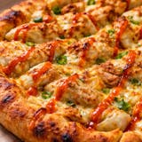 Creamy garlic sauce, mozzarella, buffalo chicken, red onions & jalapeños.