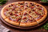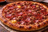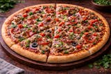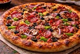 Red sauce, mozzarella, pepperoni, salami, canadian bacon, mushrooms, green peppers, red onions, olives, beef & italian sausage.