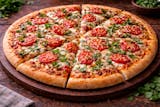 Olive oil base, roma tomatoes, mozzarella, fresh basil & asiago.