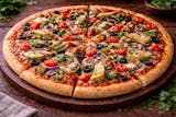 Red sauce, mozzarella, mushrooms, red onions, olives, green peppers, artichokes & tomatoes.