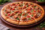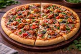 Creamy butter sauce, mozzarella, red onions, bell peppers, tomatoes, garlic, butter chicken & cilantro.