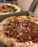 Pepperoni, sausage, Canadian bacon, onions, mushrooms, bell peppers and black olives.