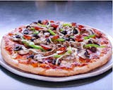Tomatoes, mushrooms, green peppers, onions, and black olives on zesty red sauce. Baked with three cheeses on our crust.