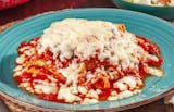 Stacked layers of pasta packed with meat and cheese, covered in red sauce. Pro tip: Go for the crispy edge pieces.