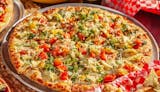 White sauce, mozzarella, garlic, mushroom, tomatoes, artichoke hearts, green onions & grated parmesan.