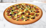 Pepperoni, mushrooms, green pepper, onions, sausage, beef, black olives.