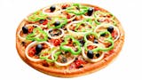 Mozzarella cheese, mushrooms, olives, bell peppers, fresh tomatoes, red onions & garlic.