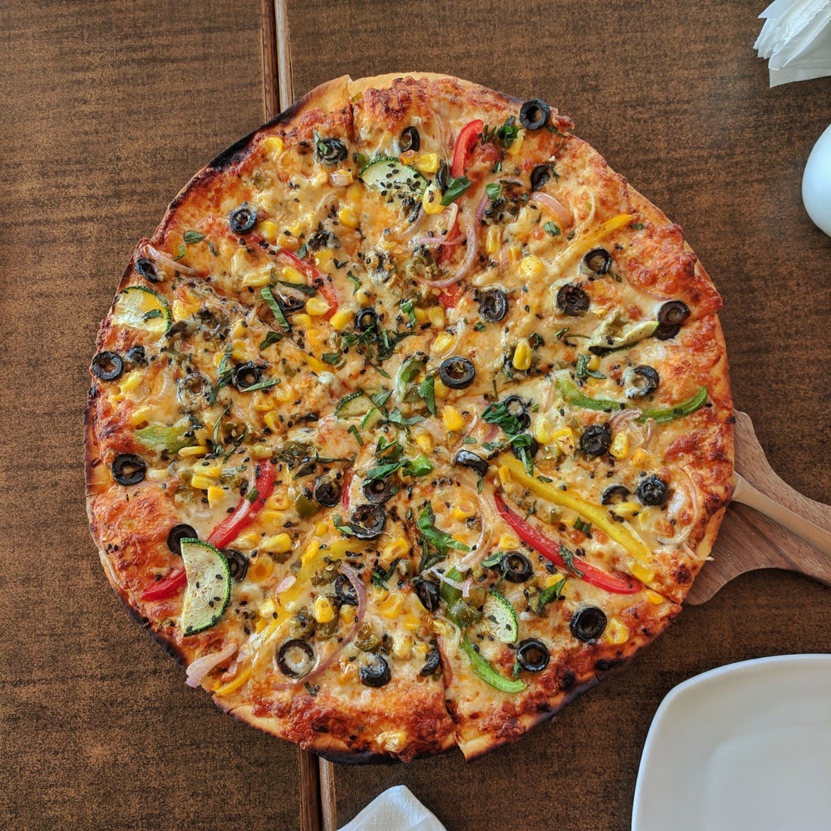 Tomato Sauce, Mozzarella, Portobello Mushrooms, Artichoke Hearts, Red Onions, Green Bell Peppers, Fresh Garlic, Fetta Cheese.