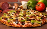 The classic combination. Pepperoni, Italian sausage, salami, linguica, beef, mushrooms, black olives, bell peppers and onion on our classic red sauce.