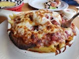 Fresh homemade breaded chicken baked in marinara sauce over a bed of mostaccioli, topped with mozzarella cheese.