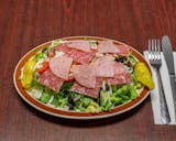Romaine lettuce, ham, salami, mushrooms, black olives, pepperoncini, red onions, Roma tomatoes, topped with mozzarella cheese.
