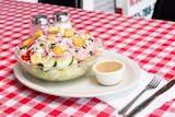 Chopped cured meats, Tomato, Cucumber, Onion Black Olives Mozzarella and Croutons.