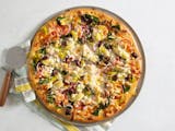 Marinara sauce, 2 types of cheese, salami, pepperoni, ham, onions, tomatoes, mix greens.