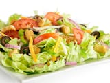 Iceberg lettuce, bell peppers, red onions, black olives, fresh Roma tomatoes, mozzarella cheese, cheddar cheese, seasoned croutons, and your choice of dressing.