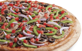 Signature red tomato sauce on our original crust, topped with mozzarella cheese, mushrooms, red onions, green peppers, black olives, fresh Roma tomatoes, salt, and pepper.
