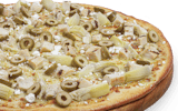 Creamy pesto garlic sauce on our Tuscany thin crust topped with mozzarella cheese, all-natural grilled chicken, green olives, marinated artichoke hearts, and feta cheese.