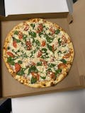 Spinach, mushroom, black olives, red roasted peppers, red onions and ricotta cheese.