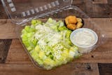 A green salad of romaine lettuce and croutons dressed with Parmesan cheese and a side dressing. (Freshly made from scratch with quality & organic ingredients.)