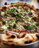 Garlic cream sauce, fresh mozzarella, cherry tomato, crispy bacon, baby arugula, honey walnut, Mike's hot honey, EVOO. White pizza.