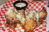 Jumbo chicken wings lightly seasoned, fried & tossed in your choice of buffalo, mango habanero, garlic parmesan, BBQ, lemon pepper or honey stingin' garlic.